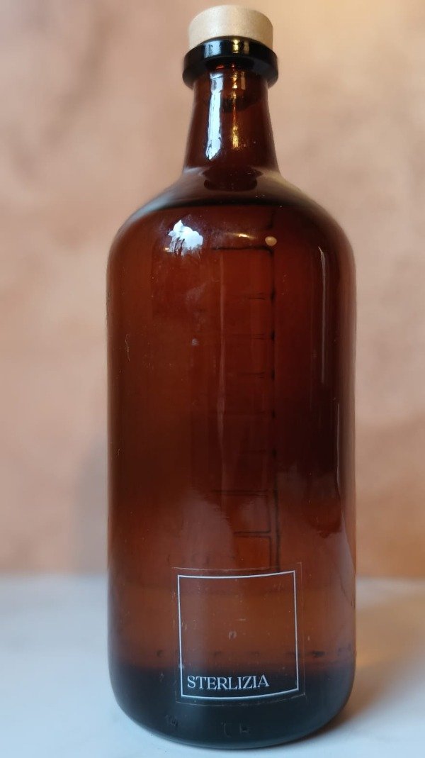 Envase de vidrio ambar reutilizable.